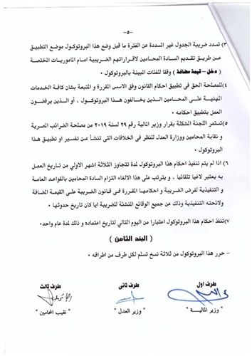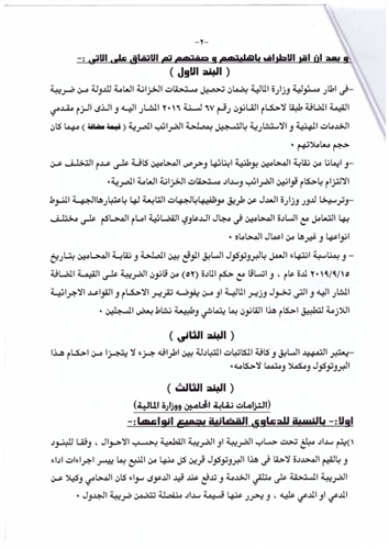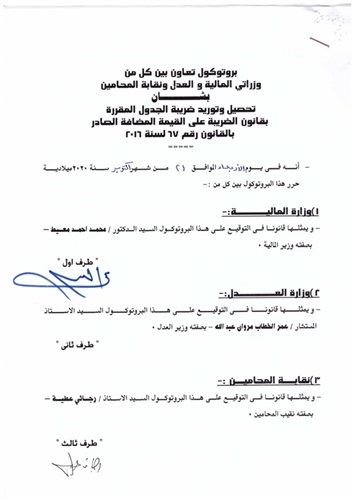 ننشر بروتوكول «القيمة المضافة» عقب توقيعه من نقيب المحامين ووزيري المالية والعدل