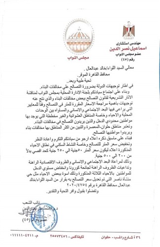 محافظ القاهرة استجاب لنصر الدين.. خفض سعر التصالح في مخالفات البناء الي 50 جنيها في حلوان والمعصرة ومايو