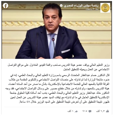 فقد وجه الدكتور خالد عبدالغفار وزير التعليم العالي والبحث العلمي، بندب أحد أساتذة كلية الحقوق جامعة الإسكندرية للتحقيق العاجل في ما تم تداوله مع إيقاف السيد عضو هيئة التدريس عن العمل لحين ظهور نتيجة التحقيق على أن تعرض نتيجة التحقيق على السيد الوزير خلال ٤٨ ساعة.