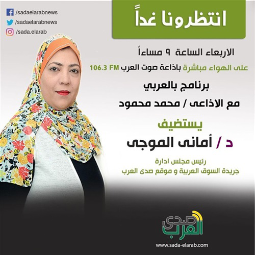 نقدم لكم البث المباشر لإذاعة صوت العرب حيث يستضيف الأستاذ محمد محمود من خلال برنامج "بالعربي" د."أماني الموجي" رئيس مجلس إدارة جريدة السوق العربية المشتركة وموقع صدي العرب، في لقاء إذاعي على الهواء مباشرة،اليوم الأربعاء ، في تمام التاسعة مساءاً،علي تردد ١٠٦٫٣ اف ام.