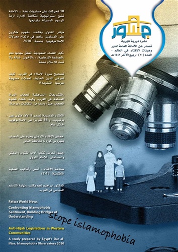 احتلت قضية ظاهرة الإسلاموفوبيا وخطاب الكراهية حيزًا كبيرًا من الأحداث التي شهدها العالم الإسلامي طيلة الفترة الماضية، وهو ما دفع "الأمانة العامة لدور وهيئات الإفتاء في العالم" إلى إصدار العدد الأخير من نشرة "جسور" الناطقة باسمها وتخصيصه لمناقشة هذه الظاهرة والوقوف على أسبابها ونتائجها.