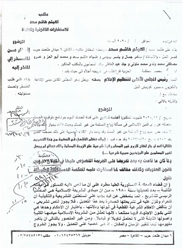 تقدم الهيثم هاشم سعد، المحامي بالنقض، بإنذار علي يد محضر لـ " كرم جبر " رئيس المجلس الأعلي لتنظيم الإعلام، وذلك لمنع آمنة نصير، عضو مجلس النواب، والأستاذة بجامعة الآزهر، وذلك علي خلفية تصريحاتها المثيرة، عن زواج المسلمة بغير المسلم.