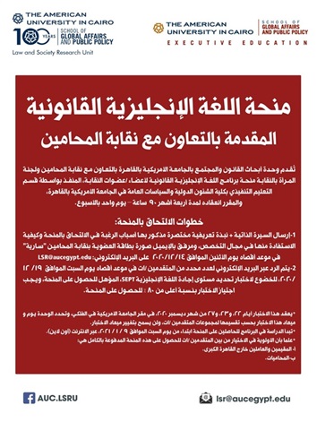 تُقدم نقابة المحامين ولجنة المرأة بالنقابة بالتعاون مع وحدة أبحاث القانون والمجتمع بالجامعة الأمريكية بالقاهرة، منحة برنامج اللغة الإنجليزية القانونية لأعضاء / عضوات النقابة، المنفذ بواسطة قسم التعليم التنفيذي بكلية الشئون الدولية والسياسات العامة في الجامعة الأمريكية بالقاهرة، والمقرر انعقاده لمدة أربعة أشهر 90 ساعة – يوم واحد بالأسبوع.