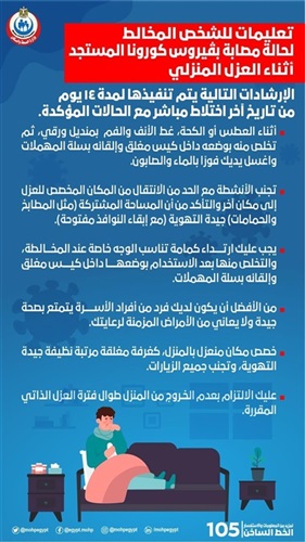 كشفت وزارة الصحة والسكان فى منشور لها عن تعليمات للأشخاص المخالطين لحالة مصابة بـفيروس كورونا أثناء العزل المنزلى.