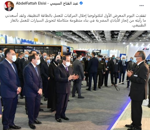 وقال الرئيس، عبر صفحته الرسمية على فيسبوك: "تفقدت اليوم المعرض الأول لتكنولوجيا إحلال المركبات للعمل بالطاقة النظيفة، ولقد أسعدنى ما رأيته من إنجاز الأيادي المصرية فى بناء منظومة متكاملة لتحويل السيارات للعمل بالغاز الطبيعى".