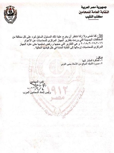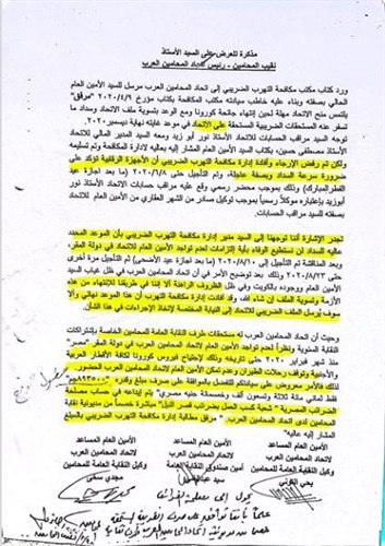 تضمنت ورود كتاب مكافحة التهرب الضريبي بشأن استحقاق ضرائب على اتحاد المحامين العرب وليس على أفراد، مقدارها ٨٩٣،٥٠٠ جنيها على الاتحاد، وتضمنت المذكرة أنه تم التوجه إلى مدير إدارة مكافحة التهرب الضريبي، فأفادتهم الإدارة بأن موعد 23 / 8 / 2020 موعد نهائي وإلا فسوف يرسل الملف الضريبي للاتحاد إلى النيابة العامة.