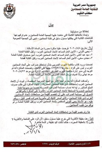 نص البيان ، انطلاقا من مسئوليتنا ، وإيمانا بالشفافية الكاملة التي عاهدنا عليها الجمعية العامة للمحامين وعدم تركهم نهبا للشائعات الكاذبة التي يطلقها مسئول سابق في نقابة المحامين، ننهي إلى الجمعية العمومية الآتي: