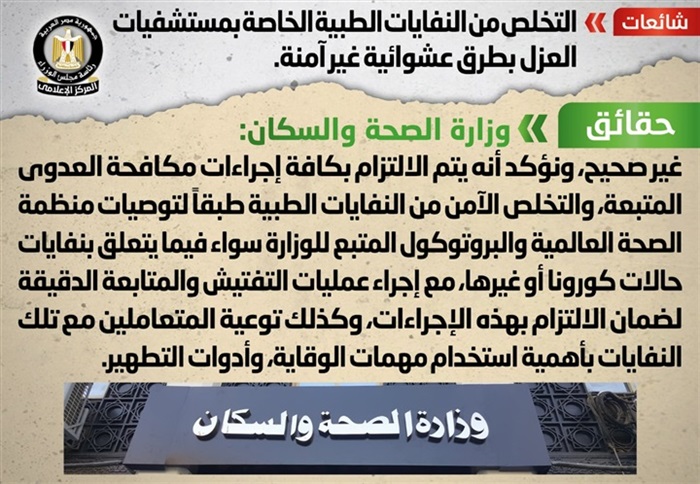 انتشر في بعض المواقع الإلكترونية وصفحات التواصل الاجتماعي أنباء بشأن التخلص من النفايات الطبية الخاصة بمستشفيات العزل بطرق عشوائية غير آمنة، وقد قام المركز الإعلامي لمجلس الوزراء بالتواصل مع وزارة الصحة والسكان، والتي نفت تلك الأنباء، مُؤكدةً أنه لا صحة للتخلص من النفايات الطبية الخاصة بمستشفيات العزل بطرق عشوائية غير آمنة، مُوضحةً أنه يتم الالتزام بكافة إجراءات مكافحة العدوى المتبعة، والتخلص الآمن من النفايات الطبية طبقاً لتوصيات منظمة الصحة العالمية والبروتوكول المتبع للوزارة سواء فيما يتعلق بنفايات حالات كورونا أو غيرها، مع إجراء عمليات التفتيش والمتابعة الدقيقة لضمان الالتزام بهذه الإجراءات، وكذلك توعية المتعاملين مع تلك النفايات بأهمية استخدام مهمات الوقاية، وأدوات التطهير.