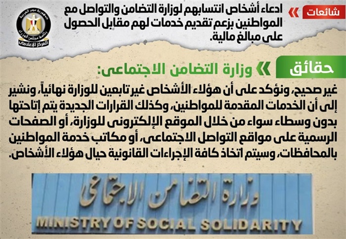 وقد قام المركز الإعلامي لمجلس الوزراء بالتواصل مع وزارة التضامن الاجتماعي، والتي نفت تلك الأنباء، مُؤكدةً أنه لاصحة لتوجيهالوزارة أشخاص للتواصل مع المواطنين بزعم تقديم خدمات لهم مقابل الحصول على مبالغ مالية، مُوضحةً أن هؤلاء الأشخاص غير تابعينللوزارة نهائياً، مُشيرةً إلى أن الخدمات المقدمة للمواطنين، وكذلك القرارات الجديدة يتم إتاحتها بدون وسطاء سواء من خلال الموقعالإلكتروني للوزارة، أو الصفحات الرسمية على مواقع التواصل الاجتماعي، أو مكاتب خدمة المواطنين بالمحافظات، وسيتم اتخاذ كافةالإجراءات القانونية حيال هؤلاء الأشخاص.