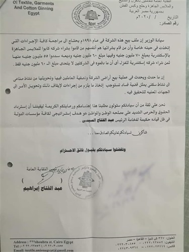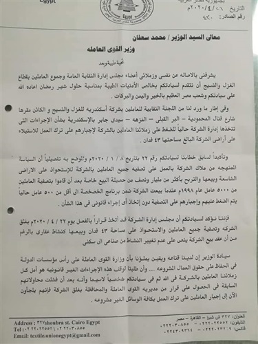وقالت النقابة في في بيان صحفي اليوم السبت ان مذكرتها،قالت إنه الحاقاً بخطاب 430 الذي تم ارساله في تاريخ 24 ابريل 2020، بشأن التصرفات غير القانونية لادارة شركة إسكندرية للغزل مع العاملين بالشركة، فقد قامت الشركة باصدار قرار مجلس ادارة بمجلسه رقم 216، بتاريخ 25 يناير 2021، بشأن انهاء خدمة جميع العاملين وعددهم 230 عامل وغلق المنشأة دون اتخاذ الإجراءات المنصوص عليها في القانون.