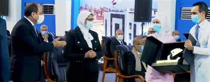 كما قدمت وزيرة الصحة والسكان درعًا تذكاريًا إهداءً من الأطقم الطبية إلى الرئيس عبدالفتاح السيسي، تعبيرًا عن شكرهم للرئيس لدعمه الدائم لهم وتلبية كافة احتياجاتهم ومساندتهم خلال مواجهة جائحة فيروس كورونا.