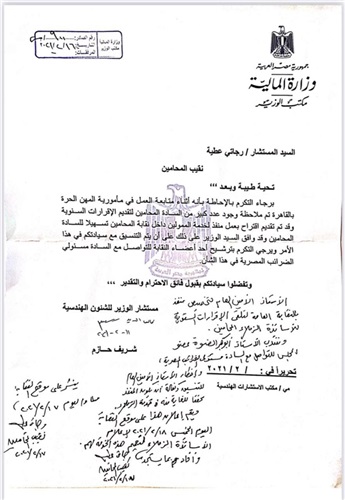 وجاء نص خطاب وزارة المالية كما يلي: السيد المستشار" رجائي عطية " نقيب المحامين تحية طيبة وبعد،،، برجاء التكرم بالإحاطة بأنه أثناء متابعة العمل في مأمورية المهن الحرة بالقاهرة تم ملاحظة وجود عدد كبير من السادة المحامين لتقديم الإقرارات السنوية وقد تم تقديم اقتراح بعمل منفذ لخدمة الممولين داخل نقابة المحامين تسهيلا للسادة المحامين وقد وافق السيد الوزير على ذلك على أن يتم التنسيق مع سيادتكم في هذا الأمر ويرجى التكرم بترشيح أحد أعضاء النقابة للتواصل مع السادة مسئولي الضرائب المصرية في هذا الشأن.
