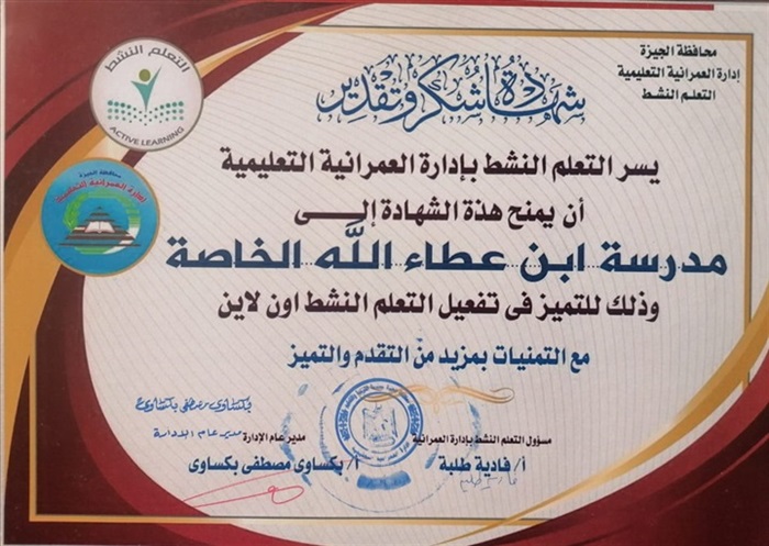 منحت وحدة التعلم النشط بإداره العمرانيه التعليمية، مدرسة ابن عطاء الله الخاصة، شهادة شكر وتقدير وذلك للتميز التي قامت به المدرسة في تفعيل التعليم النشط أون لاين.