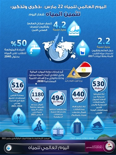 أصدر مركز المعلومات ودعم اتخاذ القرار بمجلس الوزراء إنفوجراف حول اليوم العالمي للمياه، يتضمن أهم المعلومات والتوقعات حول وضع المياه عالميًّا؛ إذ يحتفي العالم في 22 مارس سنويًّا منذ عام 1993، باليوم العالمي للمياه، تذكيرًا بأهمية المياه العذبة، وتعذر حصول أكثر من ملياري فرد على المياه الصالحة للشرب، وكذلك اتخاذ إجراءات لمعالجة أزمة المياه العالمية، بهدف تحقيق أهداف التنمية المستدامة 2030، وذلك رغم عوائق الزيادة السكانية وتغير المناخ.