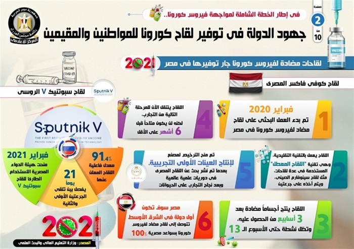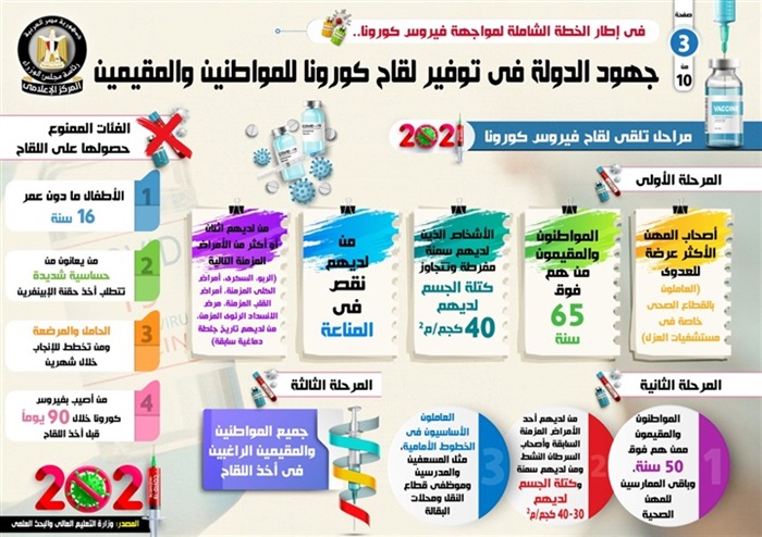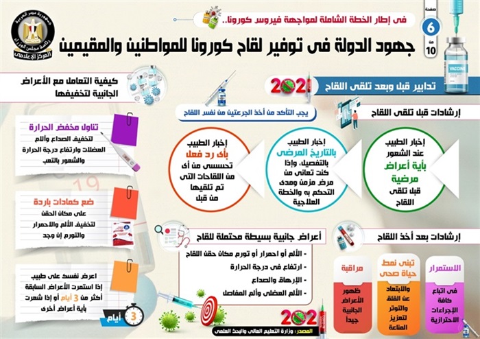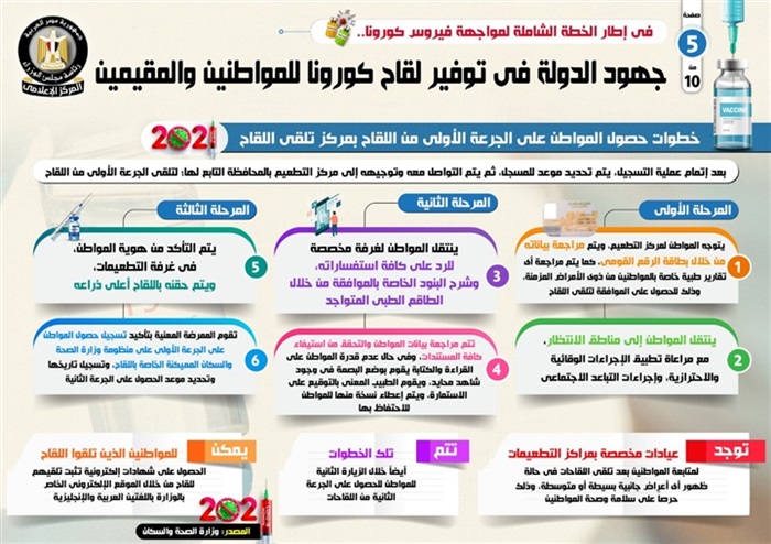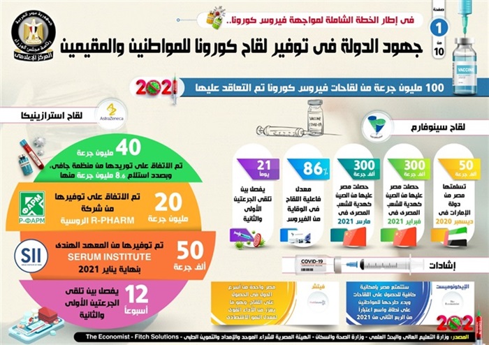 وفي هذا الصدد، نشر المركز الإعلامي لمجلس الوزراء، تقريراً تضمن إنفو جرافات تسلط الضوء على جهود الدولة في توفير لقاح كورونا للمواطنين والمقيمين، وذلك في إطار الخطة الشاملة لمواجهة الفيروس.