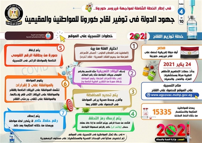 وأشار التقرير إلى أن التسجيل على الموقع الإلكتروني الخاص بالحصول على اللقاح، أصبح متاحاً للفئات المستحقة على الرابط التالي (www.egcovac.mohp.gov.eg)، كما يمكن للمواطنين المتابعة والاستفسار من خلال الخط الساخن 15335.