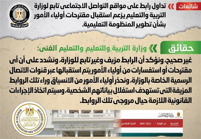نفي المركز الاعلامي لمجلس الوزراء ما تداولت بعض صفحات التواصل الاجتماعي رابطاً تابعاً لوزارة التربية والتعليم يزعم استقبال مقترحات أولياء الأمور بشأن تطوير المنظومة التعليمية، وقد قام المركز الإعلامي لمجلس الوزراء بالتواصل مع وزارة التربية والتعليم والتعليم الفني، والتي نفت تلك الأنباء، مُؤكدةً أنه لا صحة للرابط المتداول على مواقع التواصل الاجتماعي بشأن استقبال مقترحات أولياء الأمور بشأن تطوير المنظومة التعليمية، وأن الرابط مزيف وغير تابع للوزارة، مُشددةً على أن أي مقترحات أو استفسارات من أولياء الأمور يتم استقبالها عبر قنوات الاتصال الرسمية الخاصة بالوزارة، مُحذرةً أولياء الأمور من الانسياق وراء تلك الروابط المزيفة التي تستهدف استغلال بياناتهم الشخصية، وسيتم اتخاذ الإجراءات القانونية اللازمة حيال مروجي تلك الروابط.