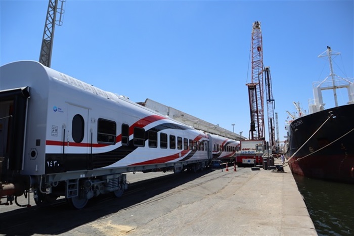 بالصور.. وصول 28 عربة سكة حديد جديدة للركاب إلى ميناء الإسكندرية ضمن صفقة تصنيع و توريد 1300 عربة جديدة للركاب
