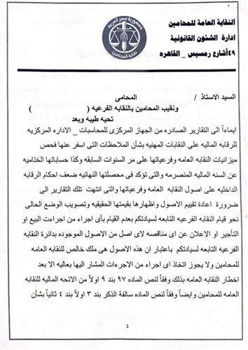 إيماءًا إلى التقارير الصادرة من الجهاز المركزي للمحاسبات الإدارة المركزية، للرقابة المالية على النقابات المهنية بشأن الملاحظات التي أسفر عنها فحص ميزانيات النقابة العامة، وفرعياتها على مر السنوات السابقة، وكذا حساباتها الختامية عن السنه المالية المنصرمة، والتي تؤكد في محصلتها النهائية ضعف إحكام الرقابة الداخلية على أصول النقابة العامة و فرعياتها، والتي انتهت تلك التقارير إلى ضرورة إعادة تقييم الأصول وإظهارها بقيمتها الحقيقية، وتصويب الوضع الحالي نحو قيام النقابة الفرعية التابعة لسيادتكم بعدم القيام بأي من إجراءات البيع أو التأجير أو الإعلان عن أى مناقصة لأي أصل من الأصول الموجودة بدائرة النقابة الفرعية التابعة لسيادتكم باعتبار أن هذه الأصول هي ملك خالص للنقابة العامة للمحامين، ولا يجوز اتخاذ أي إجراء من الإجراءات المشار إليها بعاليه إلا بعد إخطار النقابة العامه بذلك، وفقاًلنص المادة 97 بند 9.