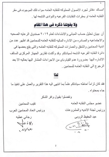 أن ببيان تحليل حساب المباني والإنشاءات لعام 2019 صندوق الرعاية الصحية والاجتماعية والصادرة من الإدارة المالية للنقابة العامة للمحامين، قد أظهر عدد من أندية المحامين، والشقق والعمارات المملوكة للنقابة العامة، والتي يقع بعضها في دائرة النقابة الفرعية التابعة لسيادتكم، وقد أكدت تقارير الجهاز المركزي السالف الإشارة إليها بضرورة عدم القيام بأي من الإجراءات المشار إليها بعاليه إلا بعد الرجوع إلى النقابة العامة للمحامين.