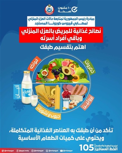 قالت وزارة الصحة والسكان، عبر انفوجراف توعوى، بصفحتها الرسمية بموقع التواصل الاجتماعى"فيس بوك"، أن هناك نصائح يجب مراعاتها فى التغذية لمريض العزل المنزلى، وذلك ضمن مبادرة رئيس الجمهورية لمتابعة حالات العزل المنزلى بمصابى كورونا ، ضمن مبادرة 100 مليون صحة خلال فترة العزل المنزلي.