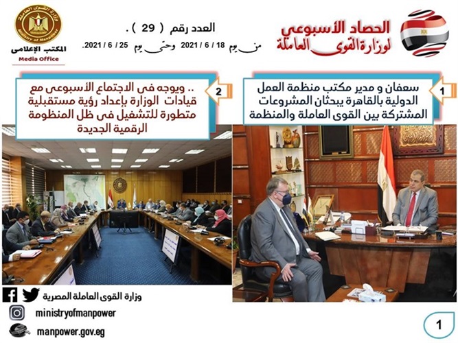 شهد حصاد الأسبوع الحالي، في وزارة القوى العاملة العديد من الأحداث المهمة خلال الفترة - من 18 يونية إلى 25 يونية الجاري- منها اجتماع الوزير الأسبوعي مع قيادات ورؤساء الإدارات المركزية بديوان عام الوزارة ، ولقائه مع إريك أوشلان مدير مكتب منظمة العمل الدولية بالقاهرة ، لبحث أوجه التعاون المشترك فيما بين الوزارة ومنظمة العمل الدولية ، واجتماع لبحث الخطوات المستقبلية لمشروعات التعاون مع المنظمة الدولية للهجرة ، وتعيين 7 آلاف و 932 شاباً في 5 محافظات ، وتحصيل 29 مليونا و562 ألفًا و696 جنيها تسوية لشكاوي العمالة المصرية بالاردن ، وتنفي الوزارة صرف 500 جنيه "معاش دائم" للعمالة غير المنتظمة.