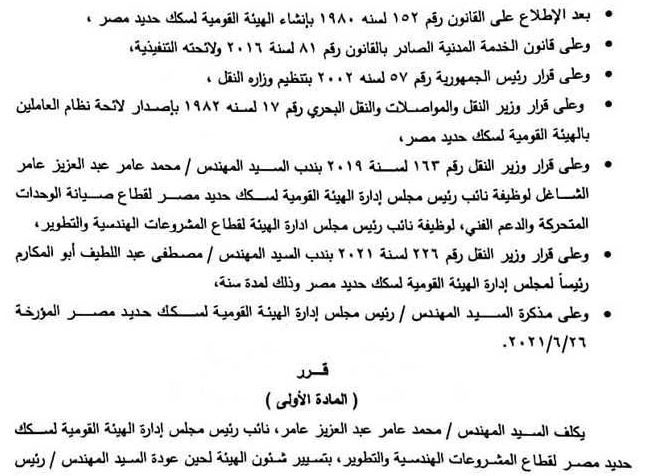 وزير النقل يكلف " عامر " قائمًا بأعمال رئيس السكة الحديد