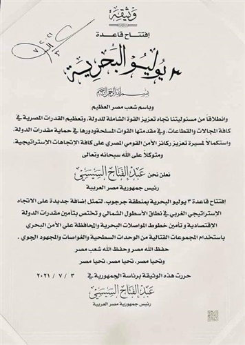 نص وثيقة الرئيس السيسي لافتتاح قاعدة ٣ يوليو البحرية