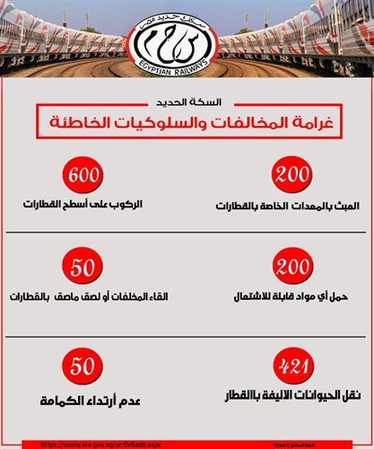 دخول منشآت السكة الحديد وملحقاتها بدون تذكرة غرامة 50 جنيه.