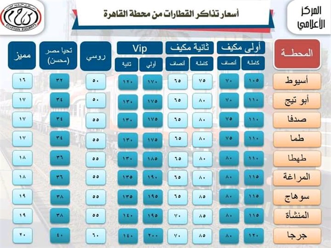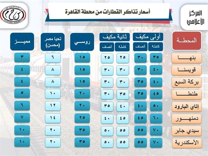 كشف هيئة السكة الحديد حقيقة ما تردد بشأن زيادة أسعار تذاكر السفر على القطارات المكيفة والروسية وغيرها من القطارات المختلفة، مؤكدة أن ما يتداول لا أساس له من الصحة.