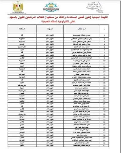 بالأسماء.. ننشر النتيجة المبدئية للطلاب المقبولين بالمعهد الفني لتكنولوجيا السكة الحديد