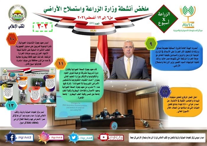 اصدر مركز المعلومات الصوتية والمرئية، التابع لوزارة الزراعة واستصلاح الاراضي، "الانفوجراف الاسبوعي" في نسخته رقم ٥١، حول الحصاد الاسبوعي لأهم أنشطة الوزارة، خلال الاسبوع الماضي في الفترة من ٦ الى ١٢ اغسطس الجاري، وذلك بالتعاون مع المكتب الاعلامي للوزارة، كما أصدر المركز ايضا ملخصا بالفيديو، حول انشطة الوزارة خلال نفس الفترة.