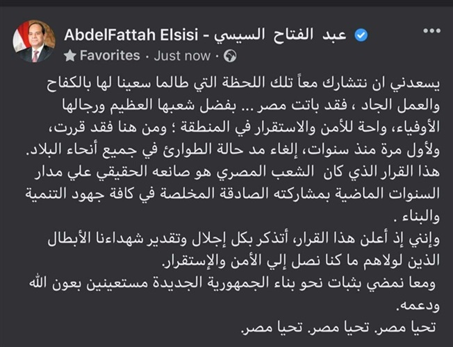 وكتب الرئيس عبدالفتاح السيسي، على صفحته الشخصية على موقع التواصل الاجتماعي فيس بوك: يسعدني أن نتشارك معاً تلك اللحظة التي طالما سعينا لها بالكفاح والعمل الجاد، فقد باتت مصر ... بفضل شعبها العظيم ورجالها الأوفياء، واحة للأمن والاستقرار في المنطقة ؛ ومن هنا فقد قررت، ولأول مرة منذ سنوات، إلغاء مد حالة الطوارئ في جميع أنحاء البلاد".