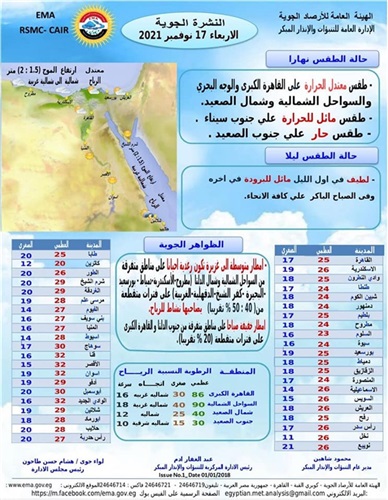 وعن حالة الطقس ليلا، توقعت الهيئة أن يسود طقس لطيف على كافة الأنحاء فى أول الليل مائل للبرودة فى آخره.