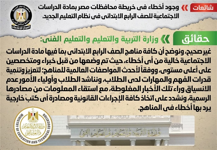 وأوضحت أن كافة مناهج الصف الرابع الابتدائي بما فيها مادة الدراسات الاجتماعية خالية من أي أخطاء، حيث تم وضعها من قبل خبراء ومتخصصين على أعلى مستوى، ووفقاً لأحدث المواصفات العالمية للمناهج؛ لتعزيز وتنمية قدرات الفهم والمهارات لدى الطلاب، مُناشدةً الطلاب وأولياء الأمور عدم الانسياق وراء تلك الأخبار المغلوطة، مع استقاء المعلومات من مصادرها الرسمية، مُشددةً على اتخاذ كافة الإجراءات القانونية ومصادرة أي كتب خارجية يرد بها أخطاء في المناهج.