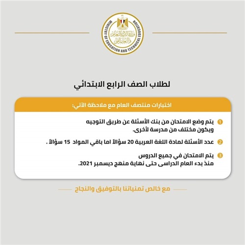 أعلنت وزارة التربية والتعليم والتعليم الفنى، جدول اختبارات منتصف العام للعام الدراسي 2021/2022 المقام في الفترة بين السبت 15/1/2021 إلى الخميس 20/1/2022 للصف الرابع الابتدائي، حيث أكدت الوزارة أنه تتم الاختبارات مع ملاحظة: