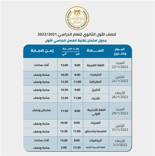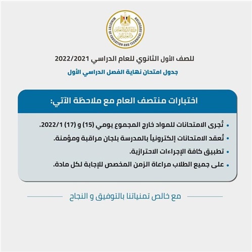 أعلنت وزارة التربية والتعليم والتعليم الفنى، جدول اختبارات منتصف العام للعام الدراسي ٢٠٢١\٢٠٢٢ المقام في الفترة بين السبت ٢٢/١/٢٠٢٢ إلى الأربعاء ٢/٢/٢٠٢٢، لطلاب الصف الأول الثانوى العام، موضحة أنه تُجرى الامتحانات للمواد خارج المجموع يومي ١٥، ١٧ يناير ٢٠٢٢، وتُعقد الامتحانات إلكترونياً بالمدرسة بلجان مراقبة ومؤمنة.