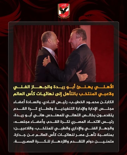 الكابتن محمود الخطيب، رئيس النادي، والسادة أعضاء مجلس الإدارة والإدارة التنفيذية وقطاع كرة القدم يتقدمون بخالص التهاني للمهندس هاني أبو ريدة، رئيس الاتحاد المصري لكرة القدم، وأعضاء مجلسه، والجهاز الفني والإداري والطبي للمنتخب، واللاعبين؛ بمناسبة تأهل مصر لنهائيات كأس العالم عن جدارة. متمنين دوام التقدم والازدهار للكرة المصرية.