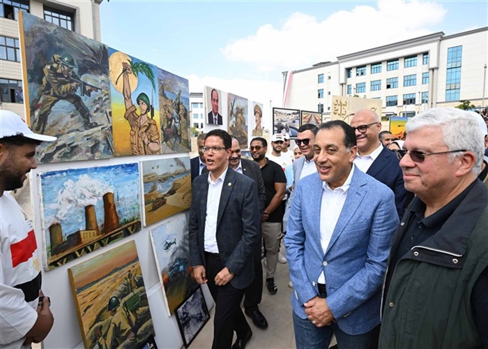 كما شاهد رئيس الوزراء ومرافقوه، معرضاً فنياً للطلاب بعنوان "الفن يجسد مسيرة بناء الجمهورية الجديدة" بالمدرج الروماني بالجامعة، تضمن لوحات فنية عبر الطلاب من خلالها عن فخرهم بوطنهم، وتضمنت لوحاتهم مشاهد مختلفة للنهضة العمرانية الكبرى التي تشهدها مصر في مختلف المجالات، فضلاً عن المشروعات القومية في مجالات التعليم والصناعة والزراعة والبنية التحتية فى مبادرة لتسجيل حجم الجهد المبذول لبناء الجمهورية الجديدة.