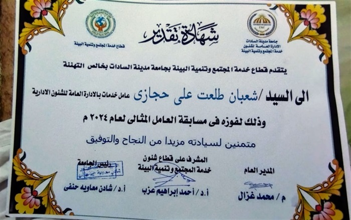 جامعة مدينة السادات تُكرم شعبان حجازي موظف العام المثالي