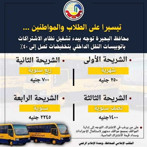 هذا وعلى من يرغب في الاشتراك، التوجه إلى إدارة المواقف بمجمع مواقف دمنهور لاستكمال الإجراءات وسداد قيمة الاشتراك للشريحة المناسبة.