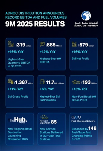 أعلنت "أدنوك للتوزيع" (ISIN: AEA006101017)، الشركة الرائدة على مستوى دولة الإمارات في قطاع الوقود ومتاجر التجزئة والمدرجة في سوق أبوظبي للأوراق المالية تحت الرمز: (ADNOCDIST)، عن تحقيق أرباح قبل خصم الفوائد والضرائب والاستهلاك والإطفاء بقيمة 885 مليون دولار خلال الأشهر التسعة من عام 2025، بزيادة قدرها 12.0%. وهو أقوى أداء تحققه الشركة خلال تسعة أشهر منذ الطرح العام الأولي في عام 2017. كما ارتفع صافي الربح خلال نفس الفترة بنسبة 15.6% على أساس سنوي.
