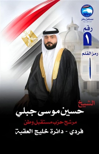حسم حسين موسى، مرشح حزب مستقبل وطن، المنافسة على المقعد الفردي بدائرة خليج العقبة من الجولة الأولى، بعد حصوله على النسبة القانونية التي تؤهله للفوز المباشر دون الحاجة إلى جولة الإعادة، وذلك وفق النتائج الأولية الصادرة عن اللجان العامة.