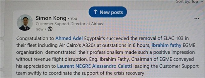 شركة أيرباص العالمية الشكر إلى شركة مصر للطيران - الناقل الوطني المصري،