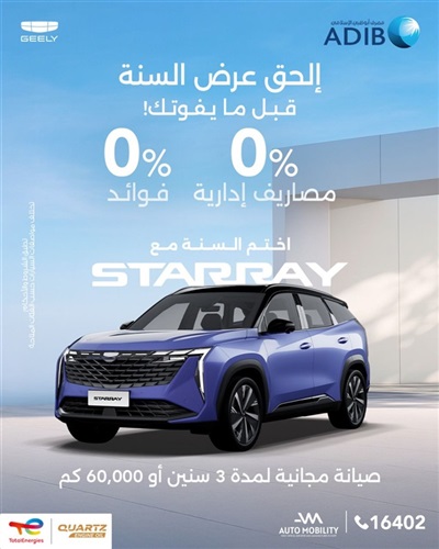 انطلاقًا من حرصها على توفير أفضل الخدمات والحلول التمويلية لعملائها طوال العام، أعلنت "أوتوموبيلتي" -الوكيل الرسمي والمُصنَّع الحصري لسيارات جيلي في مصر- عن عرض تمويلي حصري مميَّز لعملاء العلامة الصينية المرموقة، بالتعاون مع مصرف أبوظبي الإسلامي (ADIB) الذي يُقدِّم باقة متنوِّعة مِن الخدمات التمويلية المتوافقة مع الشريعة الإسلامية.