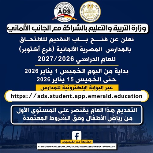 تُعلن وزارة التربية والتعليم والتعليم الفني عن فتح باب التقديم للالتحاق بالمدرسة المصرية الألمانية – فرع مدينة أكتوبر، للعام الدراسي 2026 – 2027، وذلك للمرحلة الأولى من رياض الأطفال (KG1)، لمدة 15 يومًا تبدأ اعتبارًا من اليوم الخميس الموافق 1 يناير 2026 وحتى يوم الخميس الموافق 15 يناير 2026.