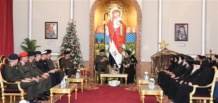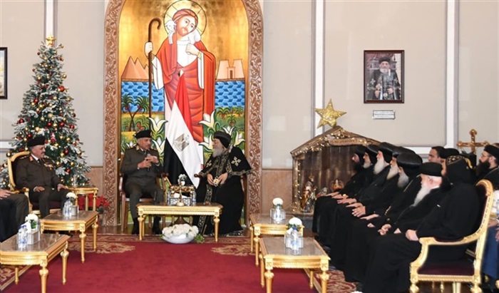 يرافقه الفريق أحمد خليفة رئيس أركان حرب القوات المسلحة وقادة الأفرع الرئيسية وعدد من قادة القوات المسلحة بتقديم التهنئة لقداسة البابا تواضروس الثانى بابا الإسكندرية وبطريرك الكرازة المرقسية بمناسبة عيد الميلاد المجيد وذلك بمقر الكاتدرائية المرقسية بالعباسية .