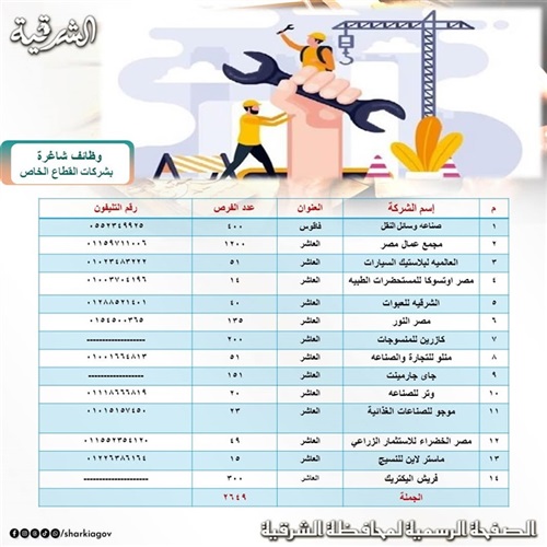 أشاد المهندس حازم الأشموني محافظ الشرقية بجهود مديرية العمل بالشرقية في توفير (٢٦٤٩) فرصة عمل شاغرة للشباب داخل (١٥) مصنع وشركة بالقطاع الخاص ليُدر عليهم دخلاً ثابتاً ليحيوا حياه كريمة.