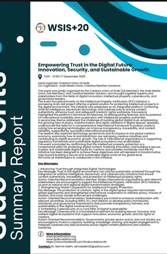 في إنجاز تاريخي للعمل العربي المشترك داخل أروقة المنظمات الدولية, قام الاتحاد الدولي للاتصالات (ITU)، التابع للأمم المتحدة بالعرض و الاشادة بمنصة "التحقق من الملكية الفكرية" (IPV) كحل تقني عالمي رائد لحماية الحقوق الإبداعية في الفضاء الرقمي. جاء ذلك خلال الاجتماع الرفيع الذي نظمه اتحاد المبدعين العرب (عضو الأمم المتحدة) ضمن فعاليات القمة العالمية لمجتمع المعلومات WSIS+20 في جنيف.