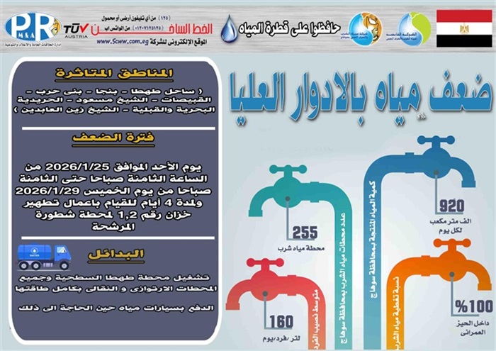 اعلنت شركة مياه الشرب والصرف الصحى بسوهاج عن ضعف المياه بالادوار العليا بقرى ساحل طهطا و بنجا و بنى حرب والقبيصات والشيخ مسعود والحريدية القبلية والبحرية والشيخ زين العابدين يوم الأحد الموافق 25 يناير 2026 فى تمام الثامنة صباحا وحتى الثامنة صباحا من يوم الخميس الموافق 29 يناير 2026 ولمدة 4 أيام صرح بذلك المهندس محمد صلاح الدين عبد الغفار رئيس مجلس الإدارة والعضو المنتدب واضاف انه يتم خلال تلك الفترة القيام باعمال تطهير خزان رقم 1, 2 لمحطة شطورة المرشحة